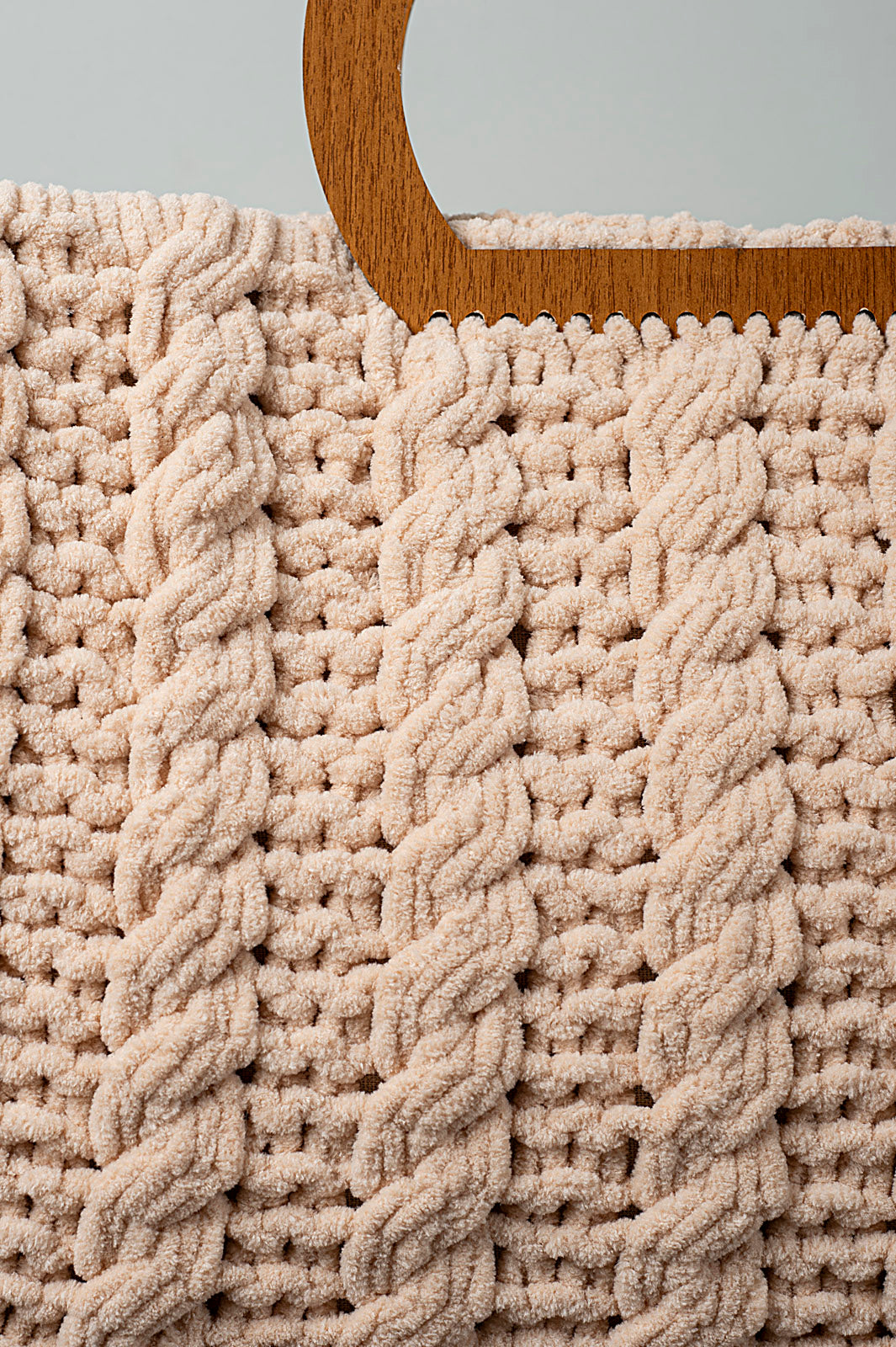 Splot jest wyraźny, przypominający grube, mięsiste warkocze. Wewnętrzna podszewka wykonana z jasnego bawełnianego materiału.